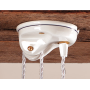 Keramikrosette mit Umlenkrolle zur Deckenbefestigung einer höhenverstellbaren Pendelleuchte mit Gegengewicht. Handgefertigtes Produkt aus Italien. Das Bild zeigt ein Anwendungsbeispiel des Artikels in einer Vintage-Stil-Aufputz-Installation.