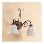 Applikationswandleuchte aus geschmiedetem Schmiedeeisen mit 2 nach unten gerichteten Leuchten mit handgefertigten spaghettiglockenförmigen Keramikdiffusoren, ideal, um in Räumen Ihres Zuhauses wie einer Taverne, einer Küche, einem Dachboden oder einem Wohnzimmer eine warme und einladende Atmosphäre zu schaffen.